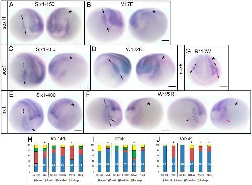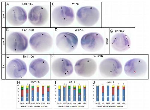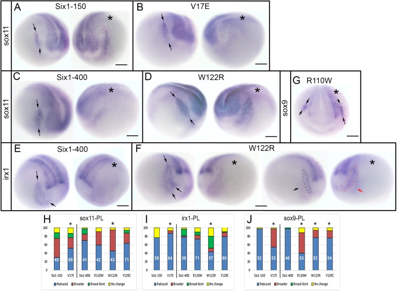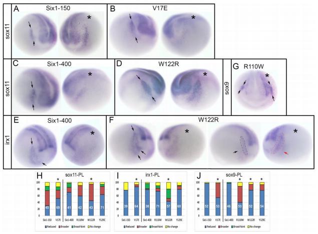 Figure 3: Changes in PPE and cranial placode gene expression. (A) Six1-150 expanded the sox11 PPE domain (between arrows on control [left] side of the same embryo). (B) V17E predominantly reduced the sox11 PPE domain (between arrows on control [left] side of the same embryo). (C) Six1-400 (right) reduced the sox11 PPE domain (between arrows on control [left] side of the same embryo). (D) W122R predominantly broadened the sox11 PPE domain. (E) Six1-400 reduced the irx1 placode domain (between arrows on control [left] side of the same embryo). (F) W122R either caused irx1 PPE domain (between arrows in left, control image) to be broader but fainter (left embryo) or simply broader (red outline and red arrow on right embryo). (G) R110W expanded sox9 expression in the otic placode (between arrows) compared to control (left) side. (H) Quantitation of sox11 cranial placode (PL) phenotypes, as in Fig. 2D. (I) Quantitation of irx1 cranial placode (PL) phenotypes, as in Fig. 2D. (J) Quantitation of sox9 cranial placode (PL) phenotypes, as in Fig. 2D. *, p<0.05. |