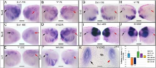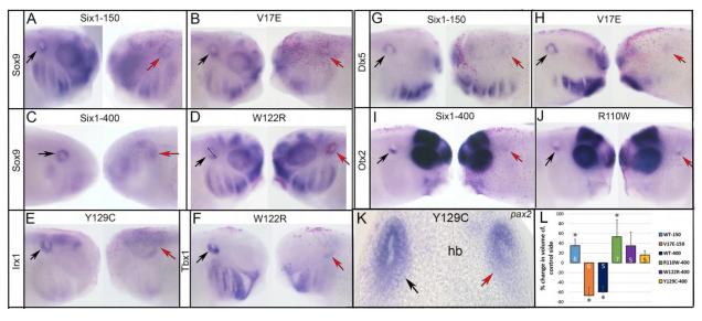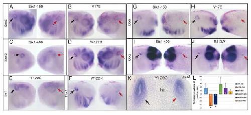 Figure 5: Examples of changes in otic vesicle gene expression. (A) Six1-150 reduced the otic expression of sox9 (red arrow) compared to control side (black arrow) of same embryo. (B) V17E had a similar effect. (C) Six1-400 reduced sox9 otic expression. (D) W122R caused slightly darker otic expression of sox9 and what appeared to be a slightly larger otic vesicle (red bar). (E) Y129C reduced irx1 otic expression. (F) W122R reduced tbx1 otic expression. (G) Six1-150 reduced dlx5 otic expression. (H) V17E also reduced dlx5 otic expression. (I) Six1-400 reduced the ventral otic expression of otx2. (J) R110W did the same. See Fig. 4 for frequencies. (K) Some larvae were sectioned to measure otic vesicle volume. In this Y129C larva, pax2 expression was reduced in the otic vesicle on the injected side (red arrow) compared to the control side (black arrow). (L) The otic vesicle volumes of SixWT, mutant Six1 and control side of the same larva were calculated (Table S1). Because larvae were different sizes, mean experimental volumes were plotted as percent change compared to mean control volumes (+/- s.e.m.) (two-tailed t-test, *, p<0.05). Six1-150 and R110W caused a significant increase in otic vesicle volume compared to the control side of the same embryo, whereas V17E and Six1-400 caused a significant decrease. Experiments were replicated three times and the number of tadpoles analyzed noted within each bar. |