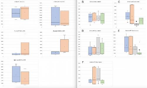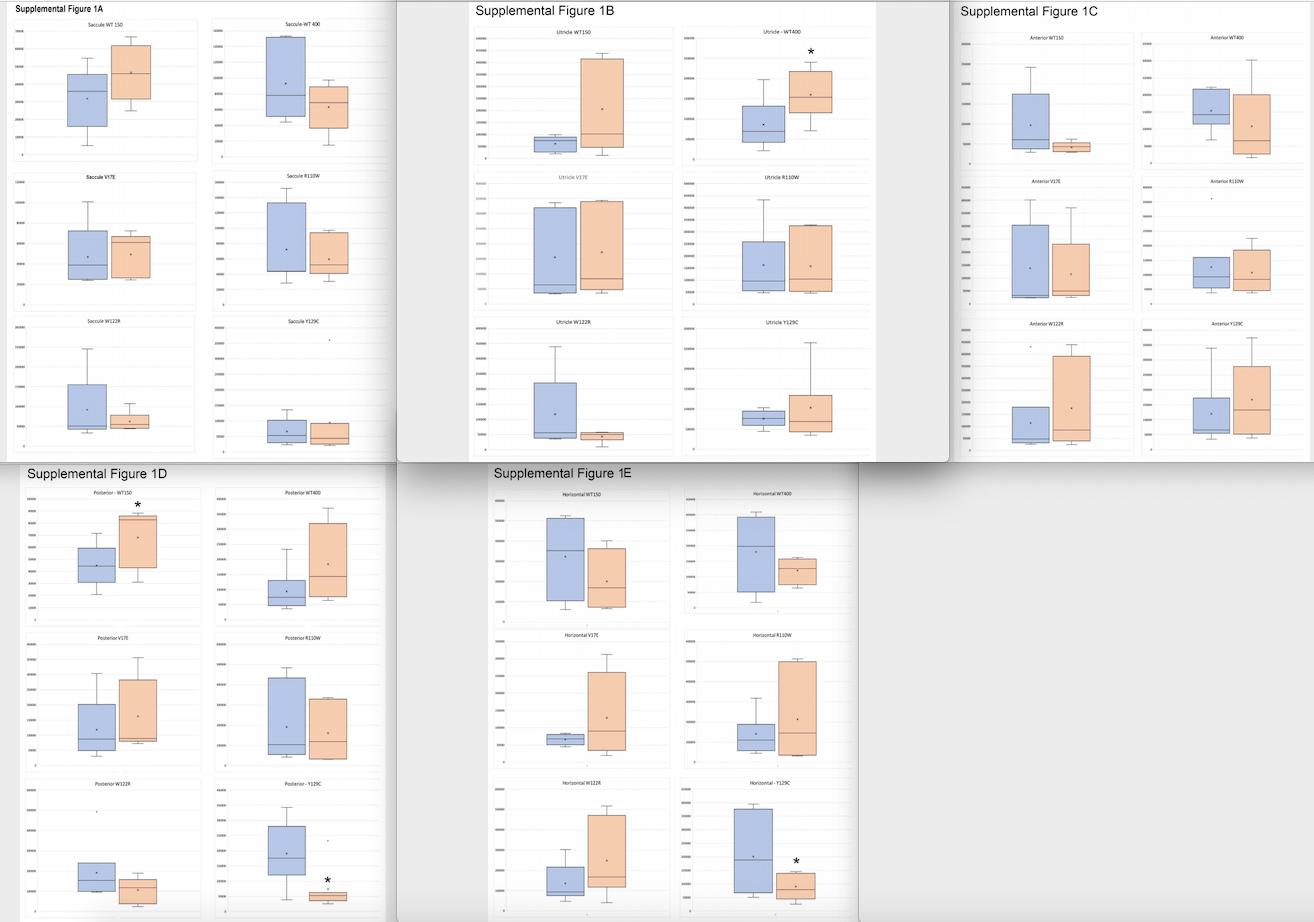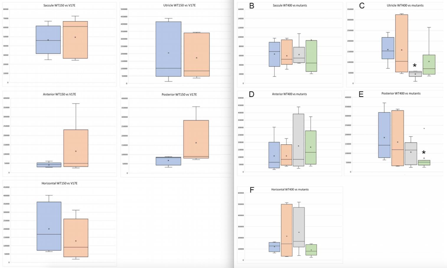 Figure S2: Comparison of sensory patch volumes (µm3) volumes between Six1WT or Six1 mutant inner ears. (A) Comparison between SixWT-150 (blue bars) and V17E (orange bars). Although there is a trend for the V17E anterior canal and posterior canal sensory patches to be larger than those of Six1WT-150, these differences did not reach significance (p>0.05, unpaired t-test). (B) Comparison between SixWT-400 (blue bar), R110W (orange bar), W122R (grey bar) or Y129C (green bar) saccule sensory patch volumes; no significant differences were detected (p>0.05, unpaired t-test). (C) Comparison between SixWT-400 (blue bar), R110W (orange bar), W122R (grey bar) or Y129C (green bar) utricle sensory patch volumes. R110W caused the largest variance and W122R and Y129C caused smaller volumes; only W122R reached significance (*, p<0.05). (D) Comparison between SixWT-400 (blue bar), R110W (orange bar), W122R (grey bar) or Y129C (green bar) anterior canal sensory patch volumes. No significant differences were detected. (E) Comparison between SixWT-400 (blue bar), R110W (orange bar), W122R (grey bar) or Y129C (green bar) posterior canal sensory patch volumes. R110W caused the largest variance and W122R and Y129C caused smaller volumes; only Y129C reached significance (*, p<0.05). (F) Comparison between SixWT-400 (blue bar), R110W (orange bar), W122R (grey bar) or Y129C (green bar) horizontal canal sensory patch volumes. R110W and W122R showed large variance, whereas Y129C caused a slight reduction. No significant differences were detected (p>0.05). Lines indicate medians, âxâ indicates means, bars indicate standard errors. |