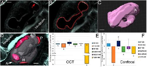 Figure 7: Mutant Six1 proteins affect inner ear luminal volumes. (A) Single confocal optical section through a phalloidin-stained tadpole inner ear showing the lumen and a single sensory patch containing hair cells (red arrow). (B) Image of same section showing outline of lumen in Imaris software. (C) Dorsal view of a 3D reconstruction of the same inner ear, showing anterior (A), posterior (P) and horizontal (H) semicircular canals. (D) Ventral view of a 3D reconstruction of an inner ear, highlighting the different sensory end-organs: A, anterior canal; H, horizontal canal; P, posterior canal; S, saccule; U, utricle. In this specimen, the amphibian papilla (am) also has differentiated, but since this was not a consistent feature at this developmental stage, it was not included in the volume measurements. (E) The inner ear luminal volumes of SixWT, mutant Six1 and control sides of the same tadpole were calculated from OCT images (Table S4) and compared by a paired, one-tailed t-test. As in Fig. 6D, the mean experimental volumes were plotted as percent change compared to mean control volumes (+/- s.e.m). Significantly smaller volumes were detected for V17E and Y129C. (*, p<0.05). (F) The inner ear luminal volumes of SixWT, mutant Six1 and control sides of the same tadpole were calculated from confocal images (Table S5) and compared by a paired, one-tailed t-test. As in Fig. 6D, the mean experimental volumes were plotted as percent change compared to mean control volumes (+/- s.e.m). Six1-400 caused a significant increase in luminal volume, whereas V17E, R110W and Y129C caused significantly smaller volumes. (*, p<0.05). Experiments were replicated three times and the number of tadpoles analyzed noted within each bar in E and F. |