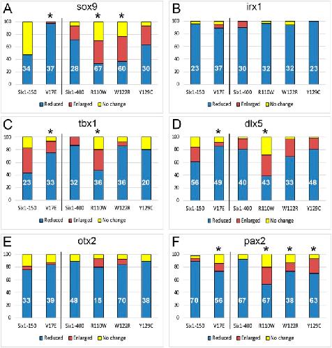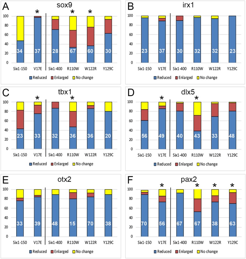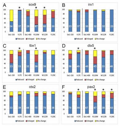 Figure 4: Frequencies of otic vesicle gene expression changes. (A) sox9, (B) irx1, (C) tbx1, (D) dlx5, (E) otx2, (F) pax2. Quantitation as described in Fig. 2D. *, p<0.05. |