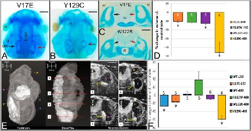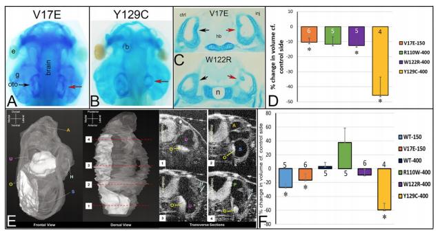 Figure 6: Mutant Six1 proteins affect otic capsule and otolith volumes. (A) Alcian blue stained tadpole head in which right side expressed V17E. The otic capsule (oto) on the injected side (red arrow) is not notably different from the control side (black arrow) in this individual. e, eye; g, gill cartilages. Similar results were seen for R110W and W122R. (B) Alcian blue stained tadpole head in which right side expressed Y129C. The otic capsule on the injected side (red arrow) is much smaller than on the control side (left). b, bubble in the mounting medium. (C) Vibratome section reveal the cartilaginous otic capsules on control (ctrl, black arrow) and injected (inj, red arrow) sides of a V17E tadpole (upper image) and W122R tadpole (lower image). hb, hind brain; n, notochord. (D) The otic cartilage volumes of mutant Six1 and control sides of the same tadpole were calculated (Table S2) and compared by a paired, two-tailed t-test. Because tadpoles were different sizes, the mean experimental volumes were plotted as percent change compared to mean control volumes (+/- s.e.m.). V17E, W122R and Y129C caused significant decreases in otic cartilage volume. (*, p<0.05; **, p<0.01). (E) Three-dimensional reconstruction of transverse sections collected using OCT. Otic vesicle is in grey with otoliths in white from frontal (left) and dorsal (middle left) views. Four transverse sections (1-4) taken at the levels indicated on the dorsal view reveal internal structures: A, anterior canal; H, horizontal canal; O, otolith; P, posterior canal; S, saccule; U, utricle. (F) Otolith volumes of SixWT, mutant Six1 and control sides of the same tadpole were calculated from OCT images (Table S3) and compared by a paired, onetailed t-test. As in (D), the mean experimental volumes were plotted as percent change compared to mean control volumes (+/- s.e.m). Six1-150, V17E, and Y129C resulted in significantly smaller otolith volumes. (*, p<0.05). Experiments were replicated three times and the number of tadpoles analyzed noted within each bar in D and F. |