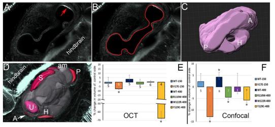 Fig. 7. Mutant Six1 proteins affect inner ear luminal volumes. (A) Single confocal optical section through a phalloidin-stained tadpole inner ear showing the lumen and a single sensory patch containing hair cells (red arrow). (B) Image of same section showing outline of lumen in IMARIS software. (C) Dorsal view of a 3D reconstruction of the same inner ear, showing anterior (A), posterior (P) and horizontal (H) semicircular canals. (D) Ventral view of a 3D reconstruction of an inner ear, highlighting the different sensory end organs: A, anterior canal; H, horizontal canal; P, posterior canal; S, saccule; U, utricle. In this specimen, the amphibian papilla (am) also has differentiated, but since this was not a consistent feature at this developmental stage, it was not included in the volume measurements. (E) The inner ear luminal volumes of SixWT, mutant Six1 and control sides of the same tadpole were calculated from OCT images (Table S4) and compared by a paired, one-tailed Student's t-test. As in Fig. 6D, the mean experimental volumes were plotted as percentage change compared to mean control volumes (±s.e.m.). Significantly smaller volumes were detected for V17E and Y129C (*P<0.05). (F) The inner ear luminal volumes of SixWT, mutant Six1 and control sides of the same tadpole were calculated from confocal images (Table S5) and compared by a paired, one-tailed Student's t-test. As in Fig. 6D, the mean experimental volumes were plotted as percentage change compared to mean control volumes (±s.e.m.). Six1WT-400 caused a significant increase in luminal volume, whereas V17E, R110W and Y129C caused significantly smaller volumes (*P<0.05). Experiments were replicated three times and the number of tadpoles analyzed noted within each bar in E and F. Scale bars: 25 μm. |