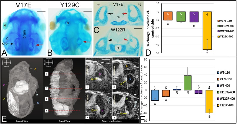 Fig. 6. Mutant Six1 proteins affect otic capsule and otolith volumes. (A) Alcian Blue-stained tadpole head in which the right side expressed V17E. The otic capsule (oto) on the injected side (red arrow) is not notably different from that on the control side (black arrow) in this individual. e, eye; g, gill cartilages. Similar results were seen for R110W and W122R. (B) Alcian Blue-stained tadpole head in which the right side expressed Y129C. The otic capsule on the injected side (red arrow) is much smaller than that on the control side (left). b, bubble in the mounting medium. (C) Vibratome section reveal the cartilaginous otic capsules on control (ctrl, black arrow) and injected (inj, red arrow) sides of a V17E tadpole (top) and W122R tadpole (bottom). hb, hind brain; n, notochord. (D) The otic cartilage volumes of mutant Six1 and control sides of the same tadpole were calculated (Table S2) and compared by a paired, two-tailed Student's t-test. Because tadpoles were different sizes, the mean experimental volumes were plotted as percentage change compared to mean control volumes (±s.e.m.). V17E, W122R and Y129C caused significant decreases in otic cartilage volume (*P<0.05). (E) Three-dimensional reconstruction of transverse sections collected using OCT. Otic vesicle is in gray with otoliths in white from frontal (leftmost) and dorsal (middle left) views. Four transverse sections (1-4) taken at the levels indicated on the dorsal view reveal internal structures: A, anterior canal; H, horizontal canal; O, otolith; P, posterior canal; S, saccule; U, utricle. (F) Otolith volumes of SixWT, mutant Six1 and control sides of the same tadpole were calculated from OCT images (Table S3) and compared by a paired, one-tailed Student's t-test. As in D, the mean experimental volumes were plotted as percentage change compared to mean control volumes (±s.e.m.). Six1WT-150, V17E and Y129C resulted in significantly smaller otolith volumes (*P<0.05). Experiments were replicated three times and the number of tadpoles analyzed noted within each bar in D and F. Scale bars: 100 μm (A,B), 70 μm (C,E). |