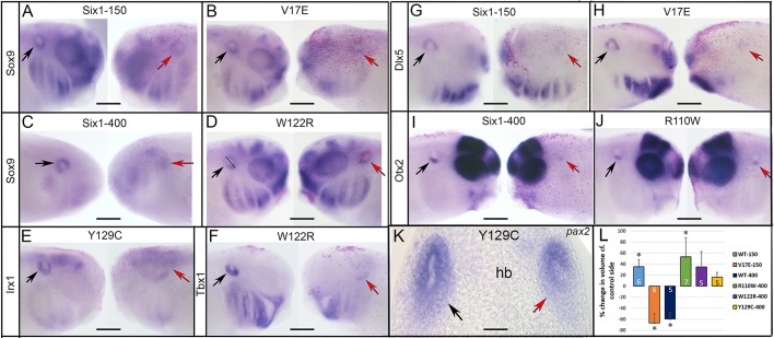Fig. 5. Examples of changes in otic vesicle gene expression. (A) Six1WT-150 reduced the otic expression of sox9 (red arrow) compared to the control side (black arrow) of same embryo. (B) V17E had a similar effect. (C) Six1WT-400 reduced sox9 otic expression. (D) W122R caused slightly darker otic expression of sox9 and what appeared to be a slightly larger otic vesicle (red bar) compared to the control side (black bar). (E) Y129C reduced irx1 otic expression. (F) W122R reduced tbx1 otic expression. (G) Six1WT-150 reduced dlx5 otic expression. (H) V17E also reduced dlx5 otic expression. (I) Six1WT-400 reduced the ventral otic expression of otx2. (J) R110W did the same. See Fig. 4 for frequencies. (K) Some larvae were sectioned to measure otic vesicle volume. In the shown Y129C larva, pax2 expression was reduced in the otic vesicle on the injected side (red arrow) compared to the control side (black arrow). hb, hind brain. (L) The otic vesicle volumes of SixWT, mutant Six1 and the control side of the same larva were calculated (Table S1). Because larvae were different sizes, mean experimental volumes were plotted as percentage change compared to mean control volumes (±s.e.m.) (two-tailed Student's t-test, *P<0.05). Six1WT-150 and R110W caused a significant increase in otic vesicle volume compared to the control side of the same embryo, whereas V17E and Six1WT-400 caused a significant decrease. Experiments were replicated three times and the number of tadpoles analyzed noted within each bar. Scale bars: 300 μm (A-J), 50 μm (K). |