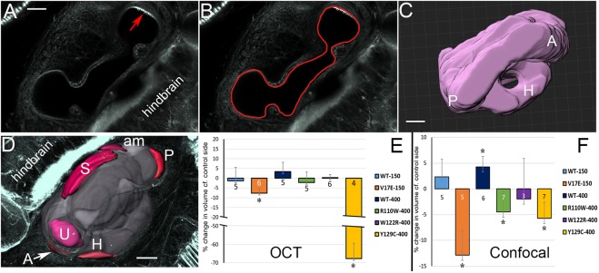 Fig. 7. Mutant Six1 proteins affect inner ear luminal volumes. (A) Single confocal optical section through a phalloidin-stained tadpole inner ear showing the lumen and a single sensory patch containing hair cells (red arrow). (B) Image of same section showing outline of lumen in IMARIS software. (C) Dorsal view of a 3D reconstruction of the same inner ear, showing anterior (A), posterior (P) and horizontal (H) semicircular canals. (D) Ventral view of a 3D reconstruction of an inner ear, highlighting the different sensory end organs: A, anterior canal; H, horizontal canal; P, posterior canal; S, saccule; U, utricle. In this specimen, the amphibian papilla (am) also has differentiated, but since this was not a consistent feature at this developmental stage, it was not included in the volume measurements. (E) The inner ear luminal volumes of SixWT, mutant Six1 and control sides of the same tadpole were calculated from OCT images (Table S4) and compared by a paired, one-tailed Student's t-test. As in Fig. 6D, the mean experimental volumes were plotted as percentage change compared to mean control volumes (±s.e.m.). Significantly smaller volumes were detected for V17E and Y129C (*P<0.05). (F) The inner ear luminal volumes of SixWT, mutant Six1 and control sides of the same tadpole were calculated from confocal images (Table S5) and compared by a paired, one-tailed Student's t-test. As in Fig. 6D, the mean experimental volumes were plotted as percentage change compared to mean control volumes (±s.e.m.). Six1WT-400 caused a significant increase in luminal volume, whereas V17E, R110W and Y129C caused significantly smaller volumes (*P<0.05). Experiments were replicated three times and the number of tadpoles analyzed noted within each bar in E and F. Scale bars: 25 μm. |