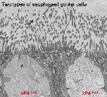 The TFF peptides xP1 and xP4 from Xenopus laevis are orthologs of TFF1 and TFF2, respectively. xP1 is secreted as a monomer from gastric surface mucous cells and is generally not associated with mucins, whereas xP4 is a typical secretory peptide from esophageal goblet cells, and gastric mucous neck and antral gland cells tightly associated as a lectin with the ortholog of mucin MUC6. Both TFF peptides have diverse protective functions, xP1 as a scavenger for reactive oxygen species preventing oxidative damage and xP4 as a constituent of the water-insoluble adherent inner mucus barrier. Here, we present localization studies using immunofluorescence and immunoelectron microscopy. xP1 is concentrated in dense cores of secretory granules of surface mucous cells, whereas xP4 mixes with MUC6 in esophageal goblet cells. Of note, we observe two different types of goblet cells, which differ in their xP4 synthesis, and this is even visible morphologically at the electron microscopic level. xP4-negative granules are recognized by their halo, which is probably the result of shrinkage during the processing of samples for electron microscopy. Probably, the tight lectin binding of xP4 and MUC6 creates a crosslinked mucous network forming a stabile granule matrix, which prevents shrinkage.
