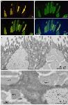 Figure 1. Labeled ultrathin methacrylate (Lowicryl K11M) sections of X. laevis stomachfundus. Fluorescence microscopy of sequential serial sections labeled for: (A) xP1 with antiserum anti-xP1-1 (Cy3, yellow); (B) xP4 with antiserum anti-xP4-1 (Cy3, yellow); (C) mucin with GSA-II (FITC, green); (D) mucin with antiserum HIK1083 (FITC, green). DNA of the cell nuclei was stained with DAPI (blue). Scale bar: 20 µm. (E) Electron micrograph of gold labeling with the anti-xP1-1 antiserum (detected with protein A-15 nm gold particles) and mucin staining with GSA-II (12 nm gold conjugates); scale bar: 2 µm.