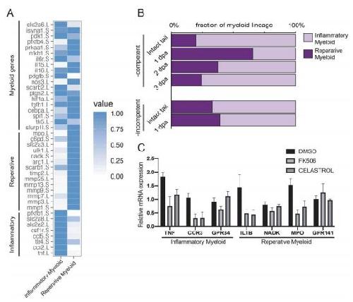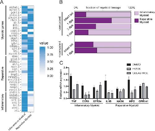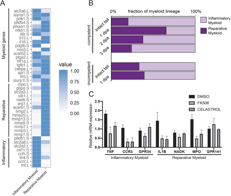 Fig. 4. A post-amputation shift from inflammatory to reparative myeloid activity characterizes regeneration-competent tadpoles. (A) Heat map showing known myeloid, reparative and inflammatory gene expression levels in the Xenopus tail cell atlas myeloid cell clusters. Values for each gene were normalized to that of the highest expressing cluster. Data were re-analysed from Aztekin et al. (2019). (B) Relative abundance of inflammatory and reparative myeloid lineage cells post-amputation in regeneration-competent and -incompetent tadpoles. Data were re-analysed from Aztekin et al. (2019). (C) Myeloid cell cluster 1 and 2 gene expressions were tested 1â day after treatment of regeneration-incompetent tadpoles with the immune-suppressing drugs FK506 or Celastrol. n>3 biological replicates for each gene expression quantification; error bars represent s.e.m. |