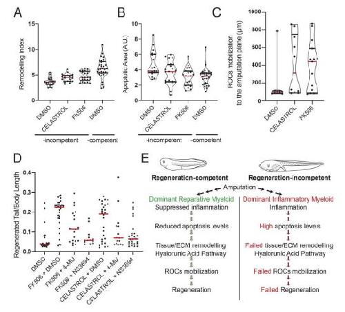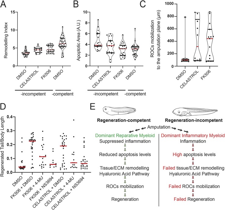 Fig. 5. Suppression of inflammation enables the emergence of a regeneration-permissive environment in regeneration-incompetent tadpoles. (A) Remodelling index at 1â dpa in FK506- or Celastrol-treated regeneration-incompetent tadpoles. All samples were obtained from three biological replicates: DMSO n=22; FK506 n=21; Celastrol n=23. Red line denotes median, and black lines denote quartiles. Note that regeneration-competent 1â dpa DMSO data from Fig. 3B were re-plotted for comparison. DMSO versus Celastrol: P<0.05 (t-test), P<0.01 (MannâWhitney U-test); DMSO versus FK506: P<0.01 (t-test), P<0.01 (MannâWhitney U-test). (B) Apoptotic area levels at 1â dpa in FK506- or Celastrol-treated regeneration-incompetent tadpoles. All samples were obtained from three biological replicates: DMSO n=19; FK506 n=20; Celastrol n=20. Red line denotes median, and black lines denote quartiles. Note that regeneration-competent 1â dpa DMSO data from Fig. 3A were re-plotted for comparison. DMSO versus Celastrol: P<0.05 (t-test), P=0.065 (MannâWhitney U-test); DMSO versus FK506: P<0.01 (t-test), P<0.01 (MannâWhitney U-test). A.U., arbitrary unit. (C) ROC relocalization levels at 2â dpa in FK506- or Celastrol-treated regeneration-incompetent tadpoles. All samples were obtained from two biological replicates: DMSO n=10; FK506 n=15; Celastrol n=10. Red line denotes median, and black lines denote quartiles. (D) Immune-suppressing drug-mediated rescue of regeneration requires apoptosis and tissue remodelling. Regeneration-incompetent tadpoles were treated with FK506 or Celastrol either alone or in combination with an inhibitor of tissue remodelling (4-MU to block the HA pathway) or an inhibitor of apoptosis (NS3694). All samples were obtained from four biological replicates: FK506+DMSO n=33; FK506+4-MU n=20; FK506+NS3694 n=13; Celastrol+DMSO n=29; Celastrol+4-MU n=15; Celastrol+NS3694 n=28. Red line denotes median, each dot represents individual tadpoles. (E) Model of myeloid lineage involvement in regeneration-competent and -incompetent tadpoles. The myeloid lineage activity controls hierarchical cellular mechanisms that create the regeneration-permissive environment required for regeneration. |