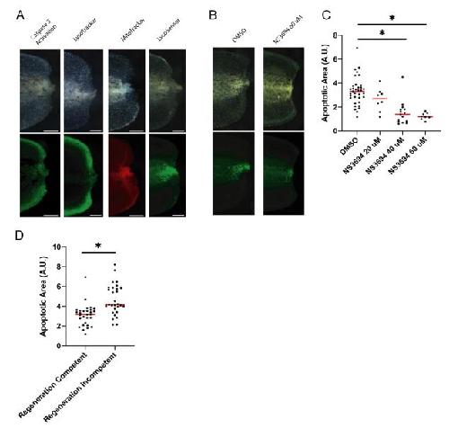 Fig S5. Lysosensor as an apoptosis reporter in amputated tail. (A) Representative images for multiple reagents tested to detect apoptosis levels at 1 dpa in regeneration-competent tadpoles. Caspase 3/7 sensor and Lysotracker, two commonly used apoptosis detection methods present multiple off target signal in the tadpole fin region. Meanwhile, Mitotracker, and Lysosensor label more specifically the regions previously reported to have amputation induced apoptosis (Tseng et al., 2007). Scale bar= 250 µm. (B) Apoptosis inhibitor (NS3694, 60 µM) treatment decreases Lysosensor signal at the amputation plane. (C) Apoptosis area quantitation in control and 20, 40 ,60 µM NS3694 treated regeneration-competent tadpoles at 1 dpa. NS3694 treatments diminished the Lysosensor signal at 1 dpa. DMSO n = 35; 20 µM NS3694 n= 8; 40 µM NS3694 n= 15; 60 µM NS3694 n= 8. One-way ANOVA used to assess statistical significance, red line denotes median, *p<0.05. (D) Apoptotic area at 1 dpa in regeneration-competent and âincompetent tadpoles. Observed apoptosis levels are in agreement with the previously published reports (Tseng et al., 2007). All samples were obtained from at least two biological replicates: Regeneration-competent n = 29; Regeneration-incompetent n = 28. Student`s t-test was used to assess statistical significance, red line denotes median, *p<0.001. |