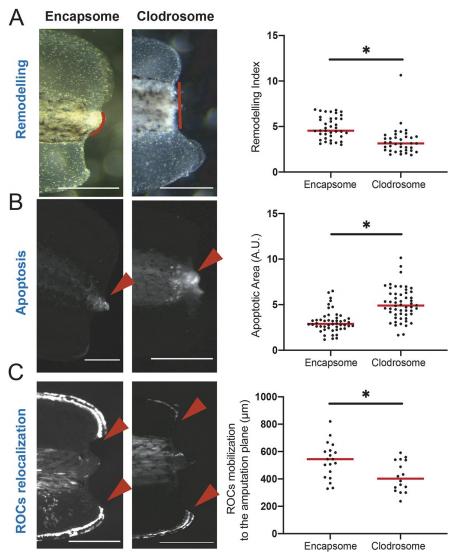 Fig. 2. The myeloid lineage is required for tissue remodelling, reduction of apoptosis levels, and relocalization of regeneration-organizing cells. (A) Left: Representative images of remodelling events occurring at 1 dpa in Encapsome- or Clodrosome-injected regeneration-competent tadpoles. Red lines indicate the posterior somitic region. Post-amputation histolysis and remodelling of tissue is impaired in Clodrosome-injected tadpoles. Scale bars: 250â µm. Right: Remodelling index quantification. All samples were obtained from at least three biological replicates: Encapsome n=39; Clodrosome n=37. Student's t-test was used to assess statistical significance; *P<0.001. (B) Left: Representative images of apoptosis occurring at 1â dpa in Encapsome- or Clodrosome-injected regeneration-competent tadpoles. The red arrowheads indicate the location of the LysoSensor signal used to report apoptosis. Scale bars: 250â µm. Right: Apoptotic area quantification. All samples were obtained from at least three biological replicates: Encapsome n=49; Clodrosome n=53. Student's t-test was used to assess statistical significance; *P<0.001. A.U., arbitrary unit. (C) Left: Representative images of ROC relocalization at 1â dpa for Encapsome- or Clodrosome-injected regeneration-competent tadpoles. The 7pbin:EGFP transgenic line was used to assess ROCs relocalization. Red arrowheads show the location of the leading ROC cells. Scale bars: 250â µm. Right: ROC relocalization quantification. All samples were obtained from at least three biological replicates: Encapsome n=19; Clodrosome n=16. Student's t-test was used to assess statistical significance; *P<0.001. In graphs, each dot represents individual tadpoles; red line denotes median. |