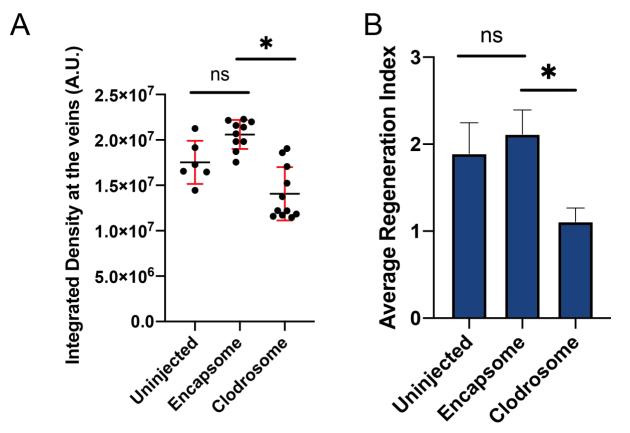 Fig S1. Clodrosome injection decreases myeloid lineage and inhibits regeneration. (A) Myeloid depletion efficiency following Encapsome or Clodrosome injections was assessed by quantifying the amount of Slurp1l expressing cell in the tail vein regions in regeneration competent tadpoles 2 days after the last liposome injection. Student`s t-test was used to assess statistical significance; *p<0.05. (B) Average regeneration index in Uninjected, Encapsome, and Clodrosome injected tadpoles. n = 3 biological replicates for each sample, error bars represent±s.e.m.. One-way ANOVA was used to assess statistical significance, *p<0.05. Note that this measurement was carried out on the same data as in Fig 1D. |