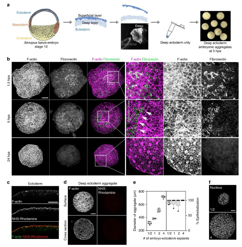 Fig. 1: Surface cells of deep ectoderm aggregates undergo epithelial-like phenotypic transition. a) Schematic of the assembly of deep ectoderm cell aggregates from early Xenopus embryo (Stage 10). b) Surface F-actin and fibronectin (FN) from maximum intensity projections at 1.5, 5, and 24âh post aggregation (hpa). Three panels on the right are higher resolution views of the inset region (white box) in the third column. Arrows indicate margin of FN where dense circumapical F-actin suggests epithelial cell phenotype. Scale bar for aggregate images is 100âµm. c) Transverse sectional view through the ectoderm of NHS-Rhodamine surface-labelled embryos. Scale bar, 50âµm. Rhodamine is restricted to the apical surface of outer epithelial cells. d) Deep ectoderm aggregates generated from NHS-Rhodamine surface-labelled embryos. Scale bar, 100âµm. Lack of rhodamine indicates absence of contaminating epithelia. e) Percent of epithelial cell phenotype found on the surface of different-sized deep ectoderm aggregates at 24 hpa. Aggregates assembled with varying amounts of embryo-ectoderm explants (1/2 explant, nâ=â6; 1 explant, nâ=â5; 2 explants, nâ=â5; 4 explants, nâ=â8). Box plot shows minimum, first quartile, median, third quartile, and maximum values. f) Labeled nuclei shown in deep ectoderm aggregates from 1/2- and 4-embryo-ectoderm explant containing aggregates. Scale bar, 100âµm. |