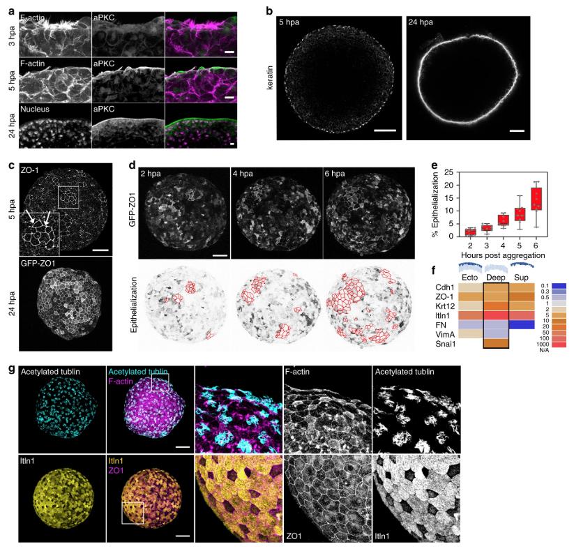 Fig. 2: Epithelialization precedes differentiation of mucus-secreting goblet cells. a) Apical polarity protein aPKC localizes on the apical surface of aggregates by 5 hpa. Scale bar, 10âµm. b) Apical localization of epithelial cytoskeleton keratin is restricted to the outer surface of deep ectoderm aggregates. Cross sectional view of aggregates at 5 hpa (Scale bar, 100âµm) and 24 hpa (Scale bar, 50âµm). c) Maximum intensity projection of epithelial tight junctional protein ZO-1 expression in aggregates at 5 hpa (top; immunofluorescence staining) and 24 hpa (bottom; GFP-ZO-1 expression). Epithelialized cells are marked by arrows (inset). Scale bar, 100âµm. d) Representative frames from a time-lapse sequence of an aggregate expressing GFP-ZO-1. Top panel: maximum intensity projection of GFP-ZO-1 shows cells undergo epithelialization (outlined with red on lookup-table-inverted images in lower panel) on the surface of aggregates from 2 to 6 hpa. Scale bar, 100âµm. e) Percentage of cells having undergone epithelialization increases over time (9 aggregates tracked from three clutches). Box plot shows minimum, first quartile, median, third quartile, and maximum values. f) qPCR expression profiling in aggregates made of ectoderm, deep layer, or superficial layer cells. Expression of epithelial (Cdh1, ZO-1, Krt12, and Itln1) and mesenchymal (FN, VimA, and Snai1) genes are analyzed for CT-based fold changes from 3 hpa to 24 hpa. g) At 24 hpa the deep ectoderm aggregate is covered by epithelial cells including differentiated mucus-secreting goblet cells (itln1) and radially intercalated multiciliated cells (acetylated tubulin). Scale bar, 100âμm. |