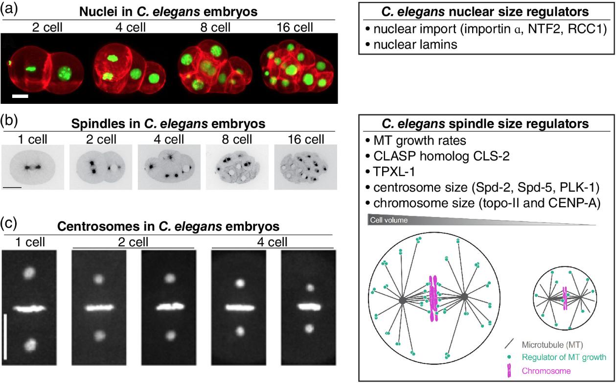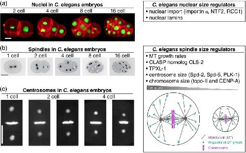 Figure 3: Developmental size regulation of intracellular structures in Caenorhabditis elegans. (a) Different stage C. elegans embryos with nuclei labeled green for H2B and plasma membrane labeled red. Scale bar, 10 μm. (Reprinted with permission from Fickentscher and Weiss (2017). Copyright 2017 Springer Nature) and made available under a Creative Commons Attribution 4.0 International License. (b) Different stage C. elegans embryos expressing GFPâtagged βâtubulin. Scale bar, 20âμm. (Reprinted with permission from Lacroix et al. (2018). Copyright 2018 Cell Press) (c) Different stage C. elegans embryos expressing GFPâtagged γâtubulin and H2B. Scale bar, 10 μm. (Reprinted with permission from Greenan et al. (2010). Copyright 2010 Cell Press) The cartoon model in the âC. elegans spindle size regulatorsâ box was reprinted with permission from Lacroix et al. (2018). Copyright 2018 Cell Press) |