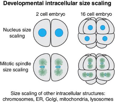 Cell division without growth results in progressive cell size reductions during early embryonic development. How do the sizes of intracellular structures and organelles scale with cell size and what are the functional implications of such scaling relationships? Model organisms, in particular Caenorhabditis elegans worms, Drosophila melanogaster flies, Xenopus laevis frogs, and Mus musculus mice, have provided insights into developmental size scaling of the nucleus, mitotic spindle, and chromosomes. Nuclear size is regulated by nucleocytoplasmic transport, nuclear envelope proteins, and the cytoskeleton. Regulators of microtubule dynamics and chromatin compaction modulate spindle and mitotic chromosome size scaling, respectively. Developmental scaling relationships for membrane-bound organelles, like the endoplasmic reticulum, Golgi, mitochondria, and lysosomes, have been less studied, although new imaging approaches promise to rectify this deficiency. While models that invoke limiting components and dynamic regulation of assembly and disassembly can account for some size scaling relationships in early embryos, it will be exciting to investigate the contribution of newer concepts in cell biology such as phase separation and interorganellar contacts. With a growing understanding of the underlying mechanisms of organelle size scaling, future studies promise to uncover the significance of proper scaling for cell function and embryonic development, as well as how aberrant scaling contributes to disease. This article is categorized under: Establishment of Spatial and Temporal Patterns > Regulation of Size, Proportion, and Timing Early Embryonic Development > Fertilization to Gastrulation Comparative Development and Evolution > Model Systems.