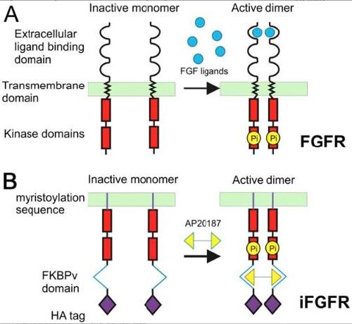 Panel (A) is a schematic diagram of a wild type FGFR. FGF ligands bind to extracellular Ig‐like domains. Receptor monomers are drawn into close proximity, and transphosphorylation of the kinase domains (red) activate downstream FGF signalling pathways. Panel (B) shows an iFgfr tethered to the cell membrane by a myristoylation domain. The 1 µM AP20187 added to culture medium binds to the FKBPv domain, bringing the kinase domains as in (A). The HA tag tethered to the FKBPv domain enables immunodetection of the construct.