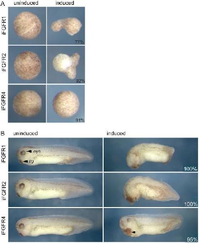 BACKGROUND INFORMATION: The fibroblast growth factor (FGF) signalling system of vertebrates is complex. In common with other vertebrates, secreted FGF ligands of the amphibian Xenopus signal through a family of four FGF receptor tyrosine kinases (fgfr1, 2, 3 and 4). A wealth of previous studies has demonstrated important roles for FGF signalling in regulating gene expression during cell lineage specification in amphibian development. In particular, FGFs have well-established roles in regulating mesoderm formation, neural induction and patterning of the anteroposterior axis. However, relatively little is known regarding the role of individual FGFRs in regulating FGF-dependent processes in amphibian development. In this study we make use of synthetic drug inducible versions of Xenopus Fgfr1, 2 and 4 (iFgfr1, 2 and 4) to undertake a comparative analysis of their activities in the tissues of the developing embryo.