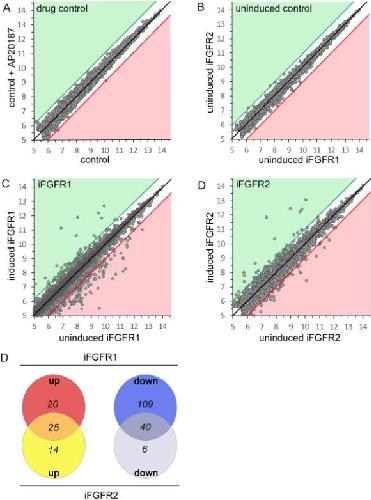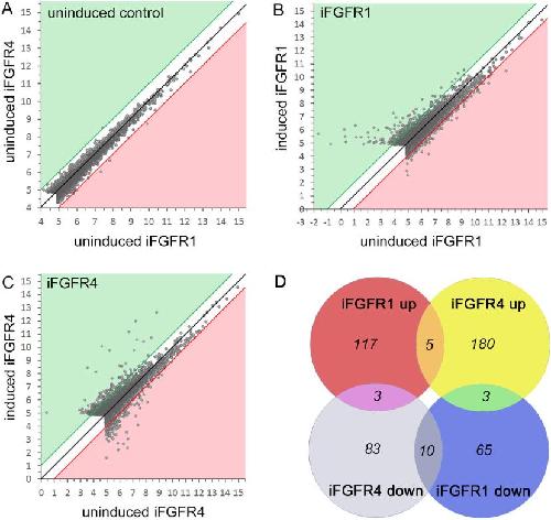 Scatterplots of log2 expression gene expression levels in neuralised animal cap explants generated from RNAâseq analysis data. Data were filtered with a cutâoff to exclude identified gene models with expression levels <30 (FKPM). Data points in the white zone, proximal to the black line (y = x) have less than twofold change in expression. Data points in the green zone have a more than twofold increase in expression relative to control (xâaxis). Data points in the red zone indicate more than twofold decrease in expression relative to control. Panel (A) compares gene expression in explants from embryos injected with 20 pg ifgfr1 or ifgfr4 mRNA in the absence of AP20187 treatment (uninduced). Panels (B) and (C) compare gene expression in explants from embryos injected with 20 pg ifgfr1 (B) or ifgfr4 mRNA (C) cultured in the absence (uninduced) or presence of 1 µM AP20187 from stage 10.5 for 3 h (induced). Panel (D) is a Venn diagram showing the overlap of gene sets up and down regulated by more than or equal to twofold following activation of iFgfr1 and iFgfr4 signalling in neuralised animal caps explants.