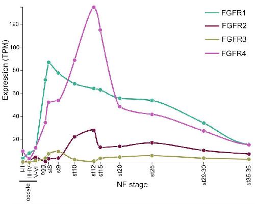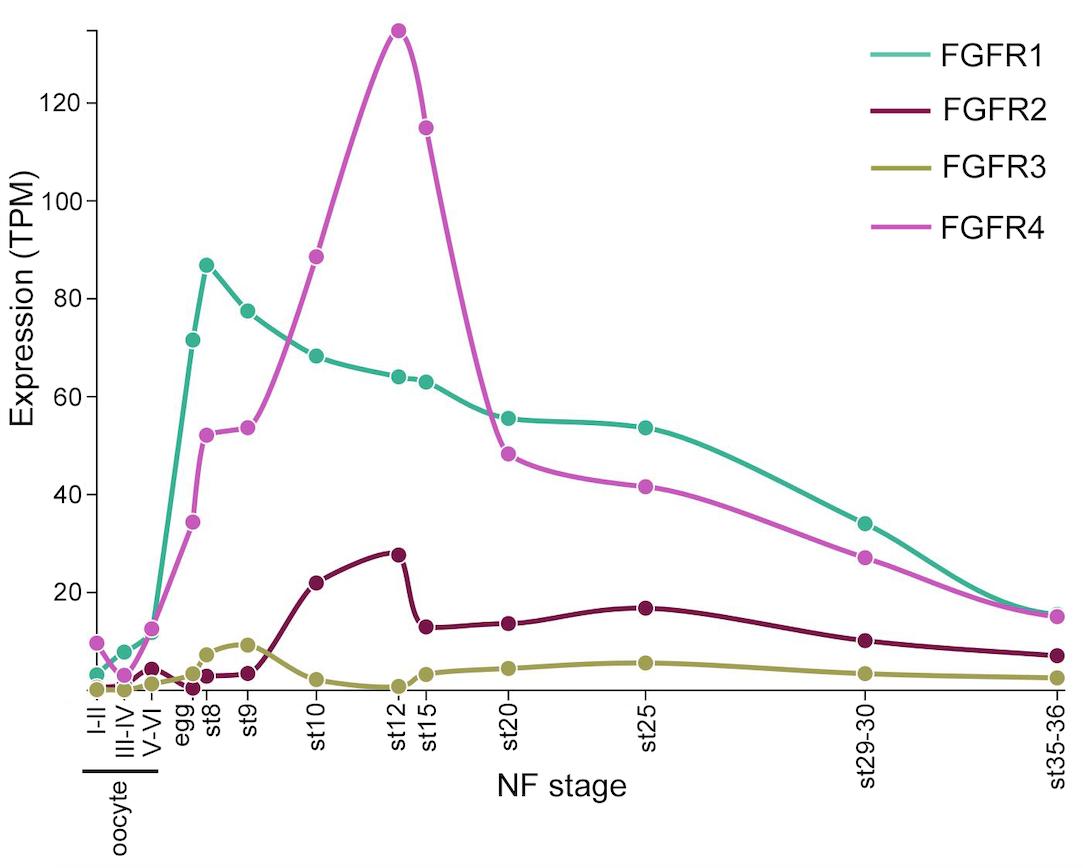 CONCLUSION AND SIGNIFICANCE: We conclude that signalling downstream of Fgfr1 and 2 regulates similar processes in amphibian development. Interestingly, many of the previously identified canonical transcriptional targets of FGF regulation associated with germ layer specification and patterning are regulated by Fgfr1/Fgfr2 signalling. In contrast, the downstream consequences of Fgfr4 signalling are different, although roles for Fgfr4 signalling in lineage specification and anteroposterior patterning are also indicated.
