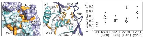 Figure 4. CBX action requires residues from both ECL1 and ECL2.(a and b) Surface (a) and cartoon (b) representations of the frPanx1 ECL1 (light blue) and ECL2 (dark blue), with potential CBX-interacting residues shown in orange. (c) Quantification of whole-cell currents from hPanx1 mutants when treated with CBX (100 μM). Mutants are numbered according to the hPanx1 sequence while the mutants in parenthesis are the corresponding residues in frPanx1. Recordings were performed by stepping to +100 mV in the absence or presence of CBX, and each point represents the normalized current amplitude during the CBX application. Bars represent the mean value from each mutant. Asterisks indicate significance of p<0.05 determined by one-way ANOVA followed by Dunnett’s test comparing WT to each mutant (F262C: p=0.0007; I247C: p=0.0471; V258C: p=0.0363). |