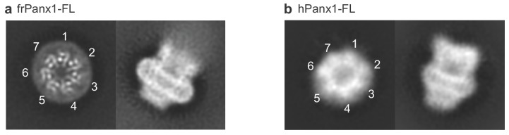 Figure 2âfigure supplement 2. 2D classes of full-length frog and human pannexin 1.(a) 2D classes of the full-length frog pannexin1 in nanodiscs showing top (left) and side (right) views. All seven protomers are labeled with numbers in the 2D class of the top view. (b) 2D classes of the full-length human pannexin one in DDM in the similar orientation to panel a. The top view shows a heptameric assembly (numbered). No symmetry was imposed in 2D classification. |