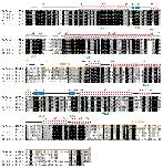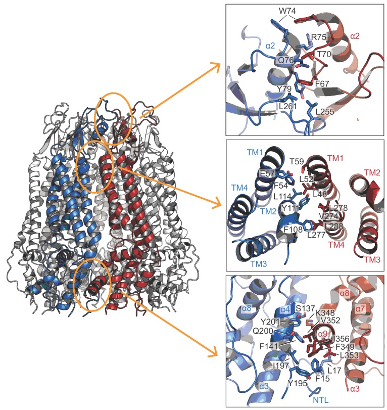 Figure 2—figure supplement 3. Inter-subunit interactions.Three major inter-subunit interfaces between two neighboring subunits (blue and red) are highlighted in orange ovals (left). Close-up views (right) show the highly-conserved residues mediating the inter-subunit interactions. |