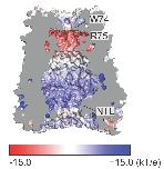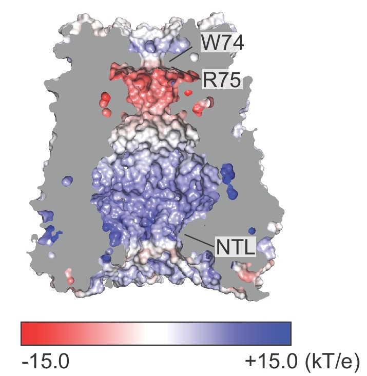 Figure 3—figure supplement 2. Electrostatic surface potential of the ion permeation pathway.A coronal section of frPanx1-ΔLC shows the surface of the ion permeation pathway. Electrostatic surface potential was calculated using APBS plugin (Baker et al., 2001) in Pymol (Schrodinger, LLC, 2015) and presented in the range between −15 kT/e (red: acidic) and +15 kT/e (blue: basic). |