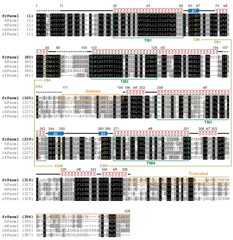 Figure 1—figure supplement 1. Sequence alignment and structural features.Amino acid sequence of frPanx1 compared to various Panx1 orthologues. Amino acids highlighted in black are completely conserved, in gray are similar, and in white are not conserved. Disulfide-forming cysteines are highlighted in yellow. Secondary structure features are shown above the sequence alignment. Green boxes depict the transmembrane helix boundaries, and orange boxes show deleted or truncated regions to create frPanx1-ΔLC. |