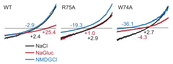 Figure 3—figure supplement 1. Representative traces of the ramp recordings.HEK293 cells were held at −60 mV and ramped between −100 mV and + 100 mV over 3 s duration. The numbers indicate the reversal potentials in mV. |