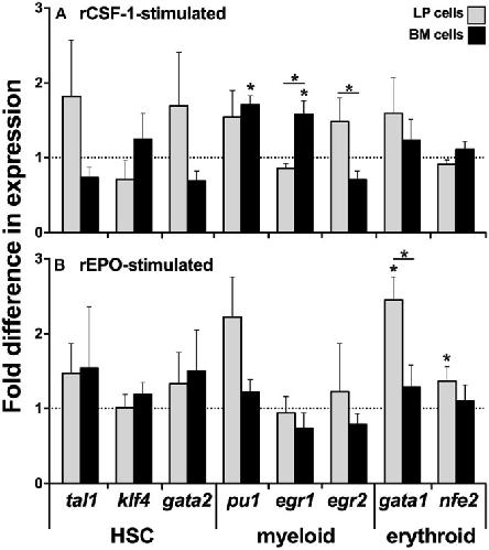 Figure 2. Analysis of lineage-specific transcription factor gene expression in liver periphery and bone marrow cells from rCSF-1- and rEPO-stimulated X. laevis. Adult X. laevis frogs were injected intraperitoneally with 5 μg of rCSF-1, rEPO, or equal volumes of r-ctrl, and 3 days later their liver periphery and bone marrow cells were assessed for lineage-specific transcription factor gene expression in (A) rCSF-1-stimulated and (B) rEPO-stimulated cells. The examined genes included hematopoietic-associated TFs: tal1, klf4, gata2, nfe2; myeloid-lineage TFs: pu1, egr1, egr2; and erythroid lineage TFs: gata1, nfe2. All gene expressions was quantified relative to the gapdh endogenous control and the gene expression is presented relative to the respective gene expression in r-ctrl-treated animals; denoted by dashed lines. Results are means ± SEM (N = 5) and asterisk overhead of horizontal lines denote statistical significance between the two cell types and (*) denotes statistical differences between the r-ctrl and respective r-growth factor stimulation, within respective cell types, P < 0.05. |