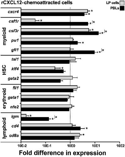 Figure 6. X. laevis rCXCL12 chemoattracts myeloid-lineage cells. Chemotaxis assay using the optimal concentration of rCXCL12 (10â3 ng/ml) was performed on liver periphery (LP) cells and peripheral blood leucocytes (PBLs; 104 LP cells or PBLs/well, cell from five individual frogs, N = 5), and the chemoattracted cells were examined for their gene expression of crcr4 (receptor for CXCL12); lineage specific markers for myeloid: csf1r (macrophage), csf3r (granulocyte), pu1, gfi1; HSC-associated: tal1, klf4, gata2; erythroid: fli1, gata1, nfe2, and lymphoid cell populations: igm (B cell); cd4 (T helper cell); and cd8 (cytotoxic T cell) by qPCR. All gene expressions was quantified relative to the gapdh endogenous control and normalized against the corresponding gene expression observed in the LP cells or PBLs (input, indicated by the dashed line) used in these chemotaxis experiments. Results are means ± SEM, (*) denotes statistical differences from the gene expression in total input LP or PBL population (indicated by the dashed line) and (*) above horizontal bars denote statistical differences between LP cells and PBLs, P < 0.05. |