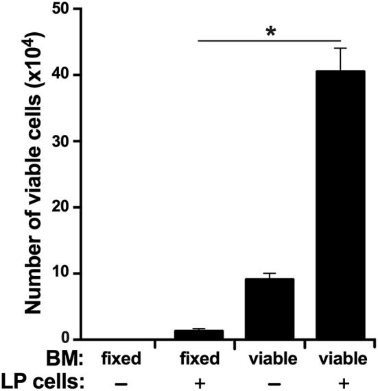 Figure 7. The X. laevis bone marrow supports the survival of liver periphery cells. The frog femurs were isolated and cut at the condyles on one side of each bone to create an opening. One femur from each animal was flushed with saline and the other with methanol to fix the stromal/supportive cells. Liver periphery (LP) cells (105 cells per femur from the same respective animals) were introduced into each of the femurs and placed in semi-solid medium with the open-end facing up. After 3 days of incubation, the viable cells in these femurs were enumerated. Results represent combined data derived from three independent such experiments, each experiment assessing tissues/cells from six individual frogs (N = 6 per experiment; N = 18). Results are means ± SEM and (*) overhead of horizontal lines denote statistical significance, P < 0.05. |