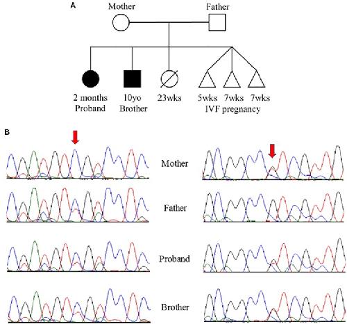 FIGURE 2. (A) Pedigree and (B) Sanger sequencing. (A) Family pedigree showing the proband and similarly affected brother (black shading). There was a prior loss of a severely premature live birth and three prior failed IVF pregnancies. (B) Sanger sequencing data from the four available family members. Red arrows indicate residue of interest. The left side shows residues around the c.394G>A change that results in D132N in one of the two alleles for TNNC1 for three of four individuals (mother is reference, other three are heterozygous for the variant). The right side shows residues around the c.435C>A change that results in D145E in one of the two alleles for TNNC1 for three of four individuals (father is reference, other three are heterozygous for the variant). |