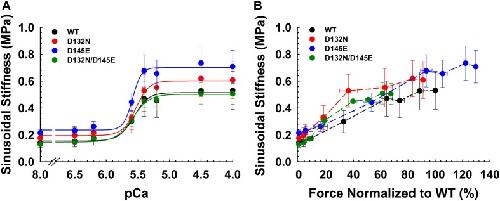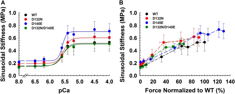 Figure 6. Sinusoidal stiffness analysis in porcine CMPs reconstituted with exogenous cTnC WT (100% WT) or variants (50% WT/50% D132N, 50% WT/50% D145E, or 50% D132N/50% D145E). (A) Ca2+ dependence of steady-state sinusoidal stiffness. (B) Normalized force vs. steady-state sinusoidal stiffness. The force values were normalized to the maximal steady-state isometric force generated by WT. (B) Dashed lines were drawn to connect the points. Data are shown as mean ± S.E. and maximum SS values are summarized in Table 3. |