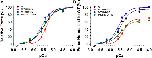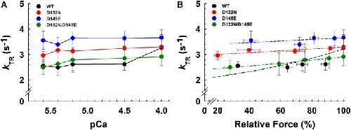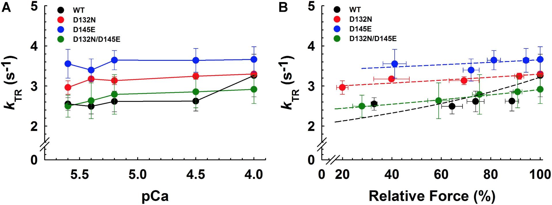 Figure 7. Rate of tension redevelopment (kTR) analysis in porcine CMPs reconstituted with exogenous cTnC WT (100% WT) or variants (50% WT/50% D132N, 50% WT/50% D145E, or 50% D132N/50% D145E). (A) kTR as a function of increasing Ca2+ concentration. Solid lines were drawn to connect the points. (B) Relative force vs. kTR. The force values were normalized to the maximal steady-state isometric force for each preparation. Data are shown as mean ± S.E. and maximum kTR values are summarized in Table 3. Dashed lines were obtained from fits to the 3-state model, which take into account the changes in Ca2+ sensitivity (Table 2 and Figures 5A,B) as described in section “Experimental Procedures”; best fit parameter estimates are summarized in Table 4. |