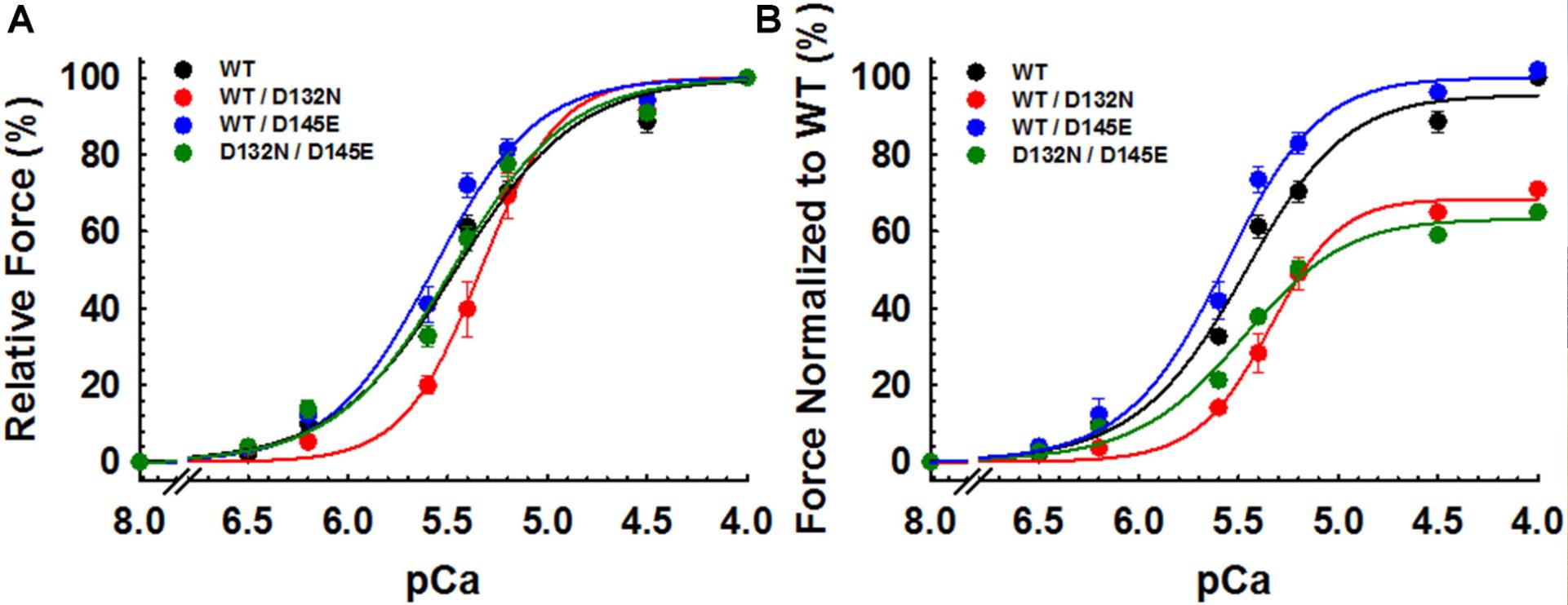 Figure 5. Ca2+ dependence of steady-state isometric tension in porcine CMPs reconstituted with exogenous cTnC WT (100% WT) or variants (50% WT/50% D132N, 50% WT/50% D145E, or 50% D132N/50% D145E). (A) Relative steady-state isometric force as a function of pCa. The force values were normalized to the maximal steady-state isometric force in the same preparation. (B) Normalized steady-state isometric force as a function of pCa. The force values were normalized to the maximal steady-state isometric force generated by WT. Data are shown as mean ± S.E. and best fit parameter estimates from non-linear least squares regression on the Hill equation are summarized in Table 2 (n = 4–8). |