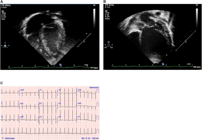 FIGURE 1. (A,B) Echocardiography images and (C) electrocardiogram. Still images obtained from echocardiogram of the proband at ages 2 weeks (A) and 12 months (B). Note particularly the progressive dilation and prominent rounding of the left ventricle (LV) in the later image. (C) Electrocardiogram at 19 months of age demonstrating sinus rhythm and left ventricular enlargement. |
