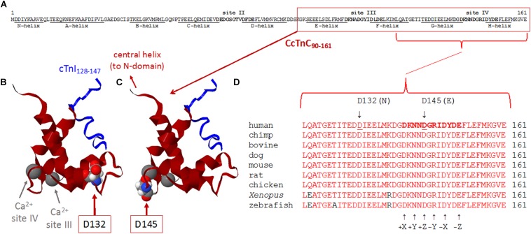 FIGURE 3. (AâD) Sequence and structure analyses of cTnC surrounding divalent cation-binding site IV. (A) Primary sequence of human cTnC (NP_003271.1). Divalent cation-coordinating regions (sites II, III, and IV) are highlighted in bold, and amino acids that comprise α-helical regions (N-helix and α-helices AâH) are underlined [annotated according to Li and Hwang (2015)]. Site II [EF-hand comprised of a-helices CâD and joining residues] is in the N-domain of cTnC and is the regulatory âtriggerâ site that activates contraction when Ca2+ binds during the systolic Ca2+ transient. Sites III and IV (EF-hands comprised of α-helices EâF or GâH, respectively, along with the respective residues that join each pair of α-helices) are in the C-domain and can bind Mg2+ or Ca2+. Note that all 161 amino acids of the primary sequence are intentionally shown as a single row to illustrate the relative sizes and locations of annotated regions. (B,C) Ribbon structures of the Ca2+-saturated C-domain of human cTnC in complex with a cardiac troponin I peptide (cTnI128â147), illustrating the locations of D132 and D145 (red arrows). NMR structure adapted from PDB 1OZS model 1 (Lindhout and Sykes, 2003) using MATLAB (ver. R2018b, The MathWorks, Inc.) molviewer. cTnC90â161 (dark red) and cTnI128â147 (blue) are shown as backbone ribbons, with space-filled atoms to highlight cTnC residues D132 and D145 (CPK colors). Ca2+ ions at sites III and IV are large gray spheres (gray arrows); note that, physiologically, it is likely that Mg2+ rather than Ca2+ would be bound at most sites III and IV in the sarcomeres of living cardiomyocytes. Labels in either panel (B) or (C) apply to the locations of structural elements in both panels. Note that only one affected amino acid is highlighted in each of panels (B,C), corresponding to the occurrence of only one of the two variants in each TNNC1 allele of the probandâs genome (Figure 2B). (D) Multiple alignments of residues around site IV demonstrate a remarkable degree of conservation of amino acids D132 and D145 across a wide range of species. Conserved amino acids are shown in red. Affected residues D132 and D145 are identified by underlines (human sequence) and arrows (above). D132 is within the G-helix (refer to panel A) that is part of site IV EF-hand. D145 is at the +Z location within the divalent cation-coordinating region of site IV; all 12 residues of this region are highlighted in bold in the human sequence (top sequence), as in panel (A), and the coordinating residues (+X, +Y, +Z, âY, âX, and âZ) within site IV are annotated (arrows) below the aligned sequences. |