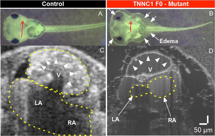Figure 4. (A,B) Brightfield microscopy and (C,D) Optical Coherence Tomography (OCT) imaging of Control and TNNC1 F0 knockout tadpoles. As compared to control tadpoles (A), TNNC1 knockout tadpoles (B) show normal gross morphology, but significant total body edema (white arrows) secondary to severe dilated cardiomyopathy leading to congestive heart failure. Red arrows indicate plane of OCT images in (C,D). OCT images demonstrate normal size and wall thickness of cardiac chambers in control tadpole (C), with severe dilation and enlargement of the ventricle in TNNC1 knockout tadpole (D), indicated with white arrowheads. V = ventricle, LA = left atrium, RA = right atrium. |