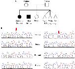 Figure 2. (A) Pedigree and (B) Sanger sequencing. (A) Family pedigree showing the proband and similarly affected brother (black shading). There was a prior loss of a severely premature live birth and three prior failed IVF pregnancies. (B) Sanger sequencing data from the four available family members. Red arrows indicate residue of interest. The left side shows residues around the c.394G>A change that results in D132N in one of the two alleles for TNNC1 for three of four individuals (mother is reference, other three are heterozygous for the variant). The right side shows residues around the c.435C>A change that results in D145E in one of the two alleles for TNNC1 for three of four individuals (father is reference, other three are heterozygous for the variant). |