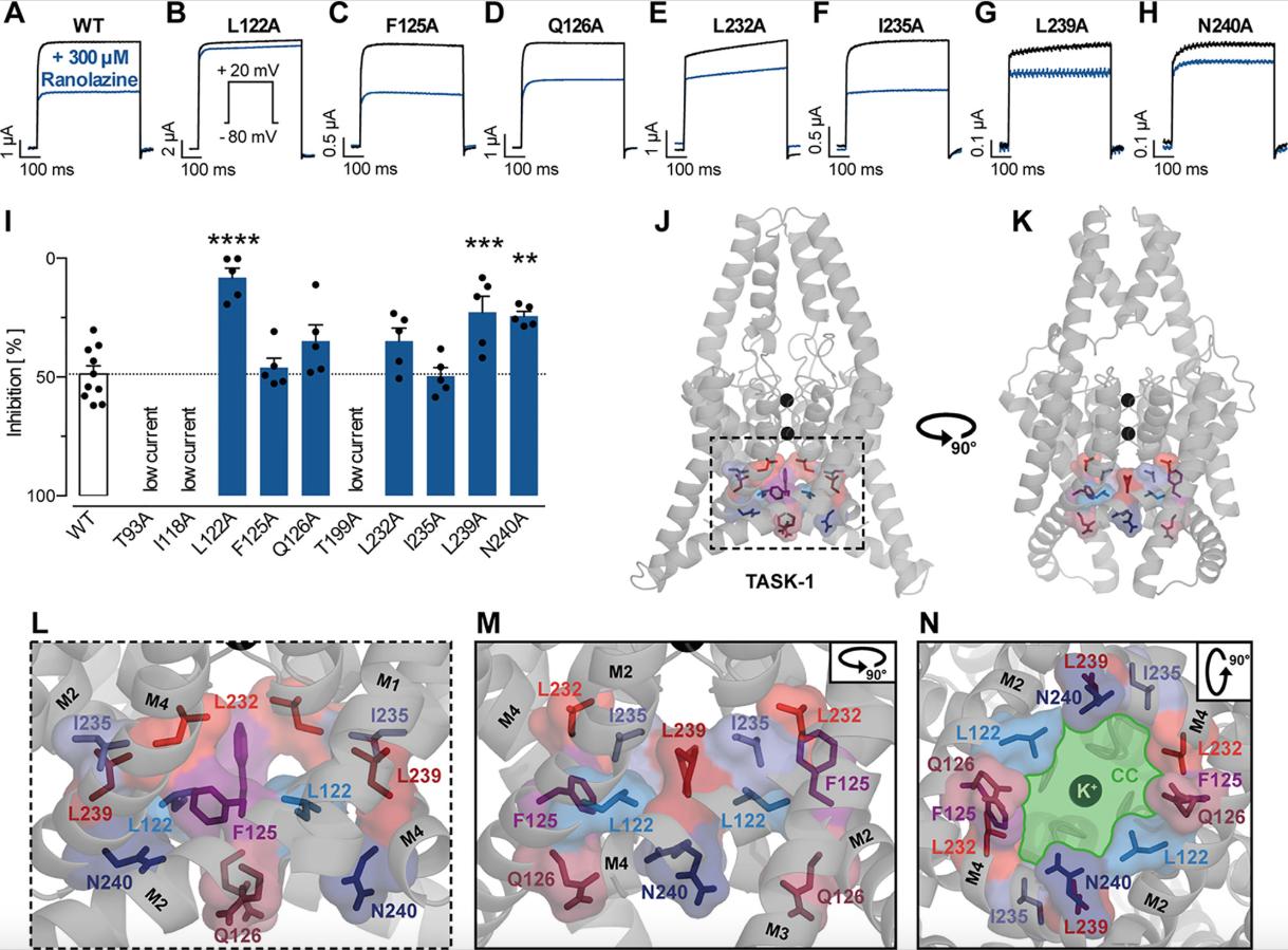 Figure 6. Effect of ranolazine on TASK-1 pore mutants. (AâH) Representative current recordings evoked by a test pulse from â80 mV to +20 mV under control conditions and after 30 min incubation with ranolazine. (I) Current inhibition by 300 µM ranolazine on the different TASK-1 pore mutants, **p < 0.01, ***p < 0.001, ****p < 0.0001, one-way ANOVA and post-hoc Bonferroniâs multiple comparisons test of WT vs. the respective mutant. (J, K) TASK-1 homology model based on TREK-1 illustrating the location of amino acid residues included in the mutagenesis screen. (L) Zoom into the inner pore region. (M) Lateral view as in panel (L) but from a different angle [as in panel (K)]. (N) View from inside the cell into the central cavity (CC) of the inner pore. Note how the displayed residues line the central cavity (illustrated in green) of the TASK-1 inner pore. |