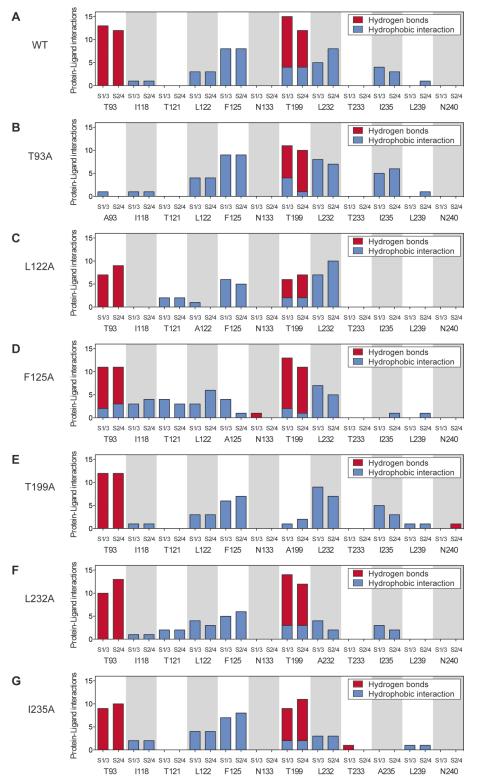 Figure S3 (Figure on previous page) Summary of protein-ligand interactions of all calculated docking poses of ranolazine at the inner pore of the wild type (WT) TASK-1 model and the different mutant variants. (A – G) The amount and character of interactions is displayed for the individual amino acid residues that interact with ranolazine. See also Figure 7 in main manuscript. |