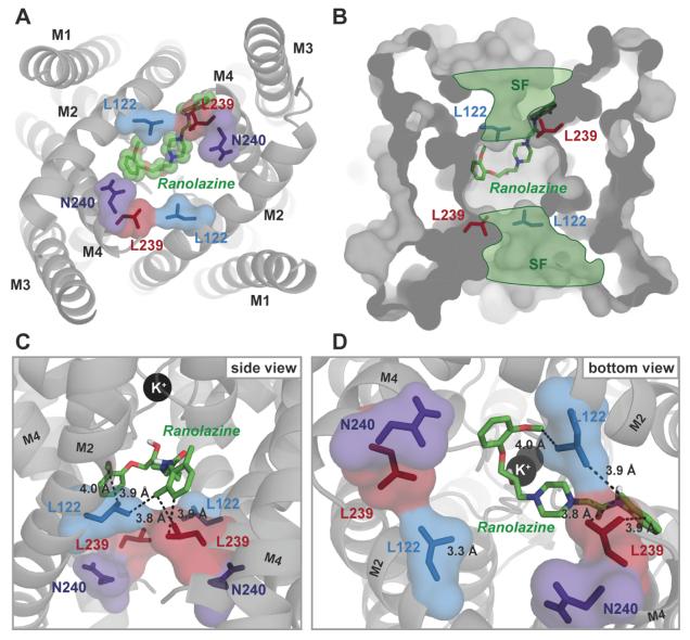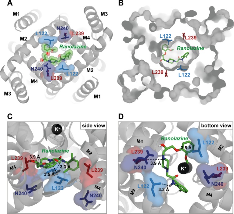 Figure 8. Ranolazine binds to the central cavity of the inner pore. (A) View from inside the cell into the central cavity. Ranolazine binds in close proximity to L122 and L239 occluding the lumen of the inner pore. (B) Same view as in (A) but with TASK-1 surface representation illustrating how ranolazine embeds within the inner pore. (C) Zoom into the central cavity illustrating the binding mode and the distance to the residues identified as binding site in the mutagenesis screen. Note that ranolazine does not directly interact with N240. (D) Similar zoom as in panel (C) but from inside the cell. Note that ranolazine interacts with L122 residues from both monomers. |