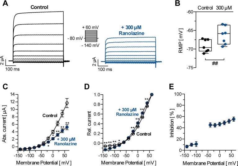Figure 2 (A) Representative TASK-1 current recordings evoked by applying the displayed pulse protocol under control conditions and after 30 min incubation with ranolazine (300 µM). (B) Resting membrane potentials (RMP) in X. laevis oocytes before and after 30 min incubation with 300 µM ranolazine (n = 7). Boxes indicate the first and third quartile, whiskers indicate the minimum and maximum, and bands inside the boxes indicate the median; ##p < 0.01, paired t-test. (C) Activation curve of TASK-1 current; amplitudes are plotted against the respective test potential under control conditions and after 30 min incubation with ranolazine (n = 10); *p < 0.05, **p < 0.01, unpaired t-test vs. control conditions. (D) Amplitudes are normalized to the maximum current amplitude at +60 mV (n = 10); *p < 0.05, **p < 0.01, unpaired t-test vs. control conditions. (E) Dependency of TASK-1 current inhibition by ranolazine on membrane potential (n = 10). Data are given as mean ± SEM. |