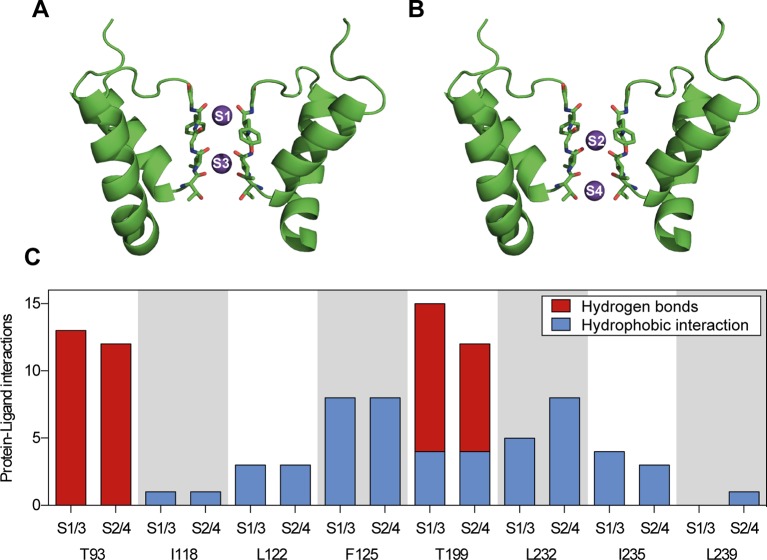 Figure 5. Summary of protein–ligand interactions of all calculated docking poses of ranolazine at the inner pore of the wild type (WT) TASK-1 model (T16cq6). (A, B) Docking calculations have been performed with potassium ions either at positions S1 and S3, or at positions S2 and S4. (C) Each calculation yielded 10 ranked docking poses, resulting in a total of 20 poses. Protein–ligand interactions have been analyzed using PLIP (Salentin et al., 2015). The amount and character of the interactions is displayed for the individual amino acid residues that interact with ranolazine. |