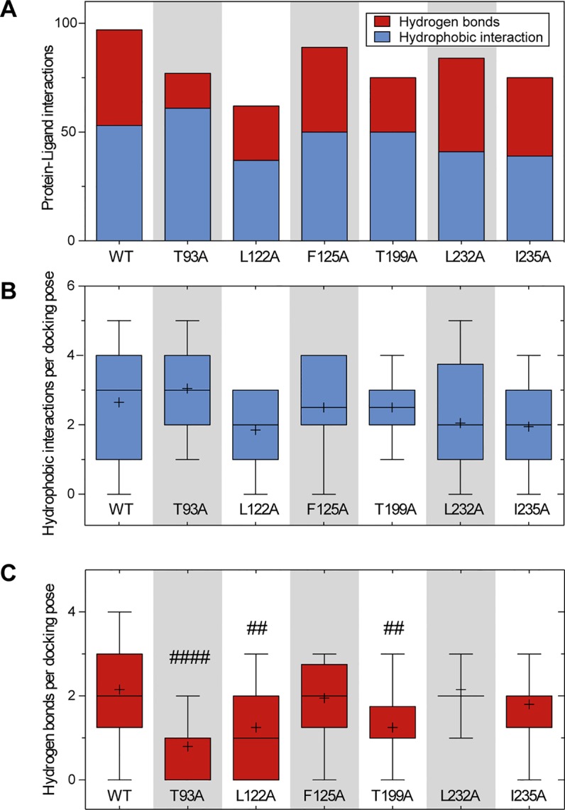 Figure 7. Comparison of the amount of protein–ligand interactions for the docking poses of WT and mutant channels. (A) Total amount and character of protein–ligand interactions of all 20 docking poses for the respective channel variant. (B, C) Boxplots indicating the amount of hydrophobic interactions (B) and hydrogen bonds (C) per docking pose. Boxes indicate the first and third quartile, whiskers indicate the minimum and maximum, bands inside the boxes indicate the median, and + indicates the mean. ##p < 0.01, ####p < 0.0001vs. WT. Note that variant L122A that has been identified as being most relevant for ranolazine binding in the experimental data, also forms the fewest interactions in the in silico simulations. More detailed information on the interaction profiles of ranolazine and the individual mutant variants can be found in Supplementary Figure S3 . |