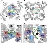 Figure 8 Ranolazine binds to the central cavity of the inner pore. (A) View from inside the cell into the central cavity. Ranolazine binds in close proximity to L122 and L239 occluding the lumen of the inner pore. (B) Same view as in (A) but with TASK-1 surface representation illustrating how ranolazine embeds within the inner pore. (C) Zoom into the central cavity illustrating the binding mode and the distance to the residues identified as binding site in the mutagenesis screen. Note that ranolazine does not directly interact with N240. (D) Similar zoom as in panel (C) but from inside the cell. Note that ranolazine interacts with L122 residues from both monomers. |