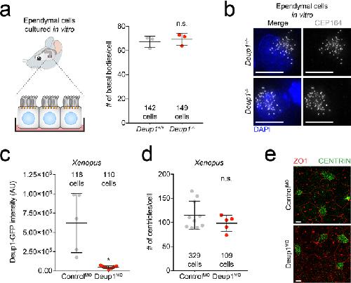 Fig. 2. Deuterosomes are dispensable for centriole amplification during multiciliogenesis(a) Quantification of basal body number in mTECs from Deup1+/+ and Deup1â/â mice. Basal bodies were stained with CEP164. n = 3 mice/genotype. The total number of cells analyzed per genotype is indicated. P values, unpaired, two-tailed, Welchâs t-test. n.s. = not statistically significant (p > 0.05). Bars represent mean +/â SD.(b) Representative images of basal bodies stained with CEP164 from Deup1+/+ and Deup1â/â mTECs. Scale bars represent 5 μm.(c) Quantification of the basal body marker CEP164 foci in ependymal cells from Deup1+/+ or Deup1â/â adult brain sections. n = 3 mice/genotype. The total number of cells per analyzed genotype is indicated. P values, unpaired, two-tailed, Welchâs t-test. n.s. = not statistically significant (p > 0.05). Bars represent mean +/â SD.(d) Representative images of ependymal cells in adult brain sections from Deup1+/+ or Deup1â/â mice. DAPI marks the nuclei, ZO-1 marks tight junctions and CEP164 stains basal bodies. Scales bar represent 10 μm.(e) Scanning electron microscopy images of tracheas from Deup1+/+ or Deup1â/â adult mice. Scale bar represents 10 μm. |
